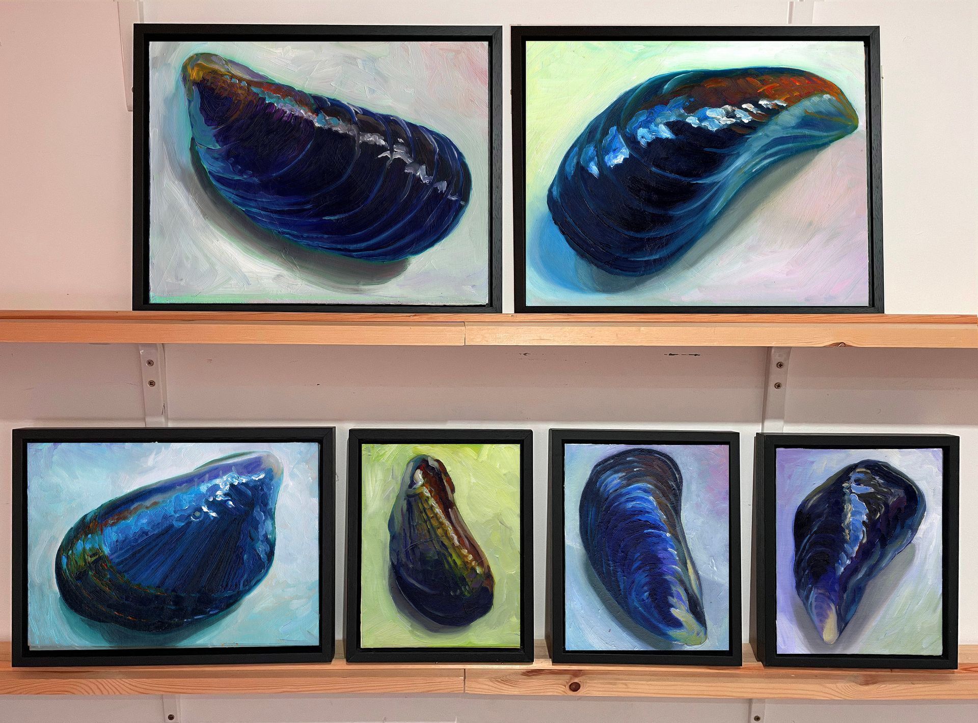 I recently started painting mussels after designing my middle son's wedding invitation that featured a circle of cockles and mussels. Although those were in watercolour I soon began to scale them up to oils and have had a wonderful time painting them the last four months.