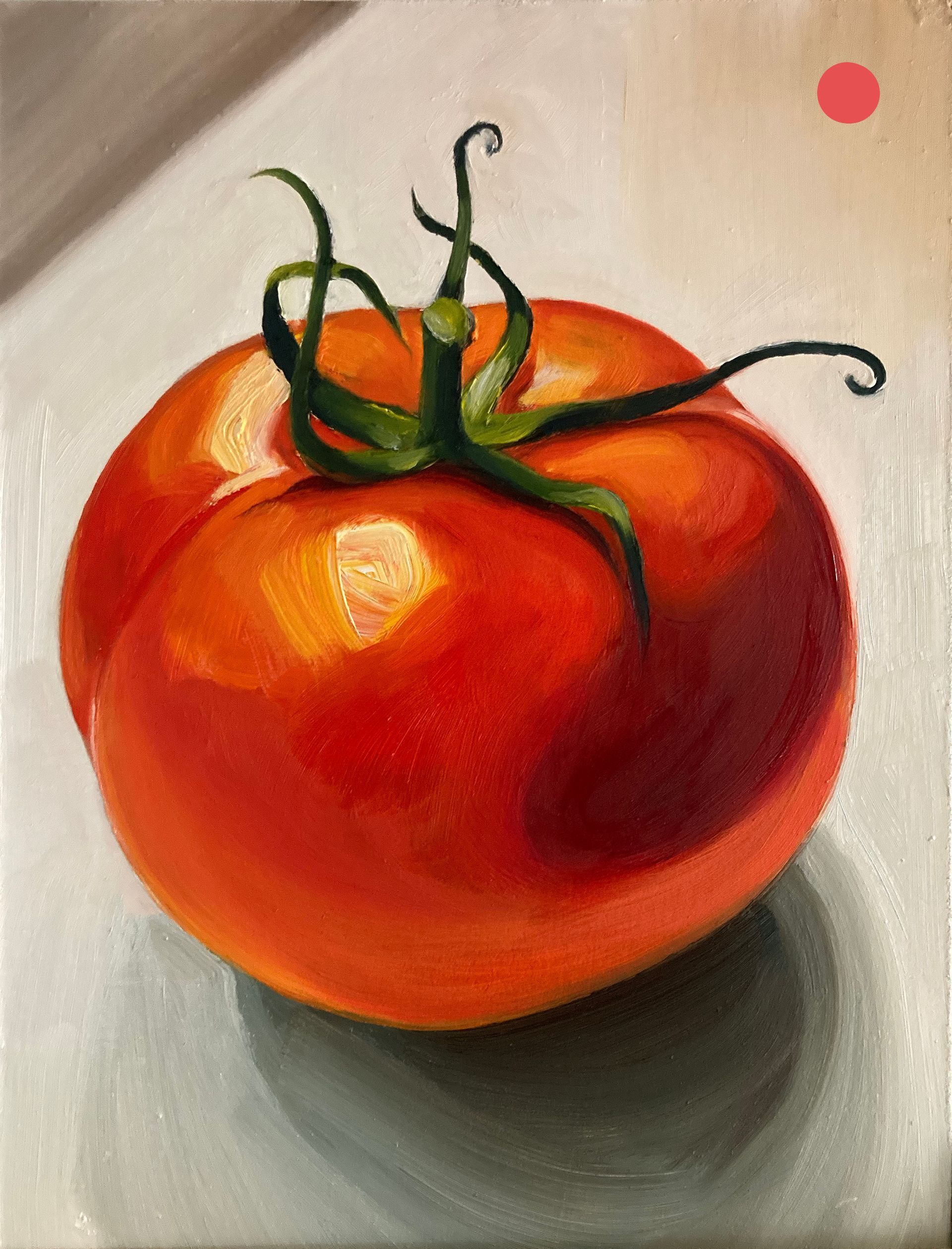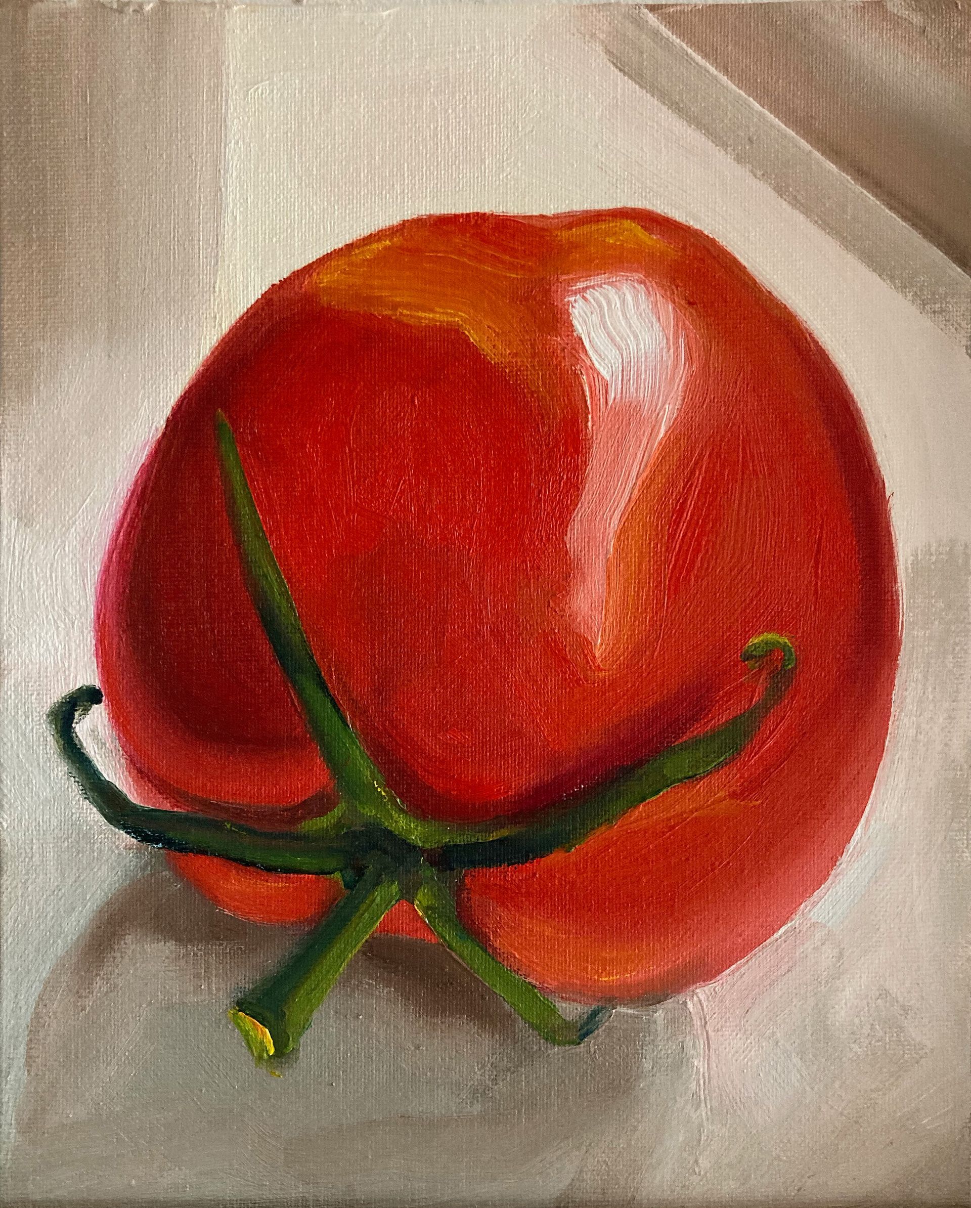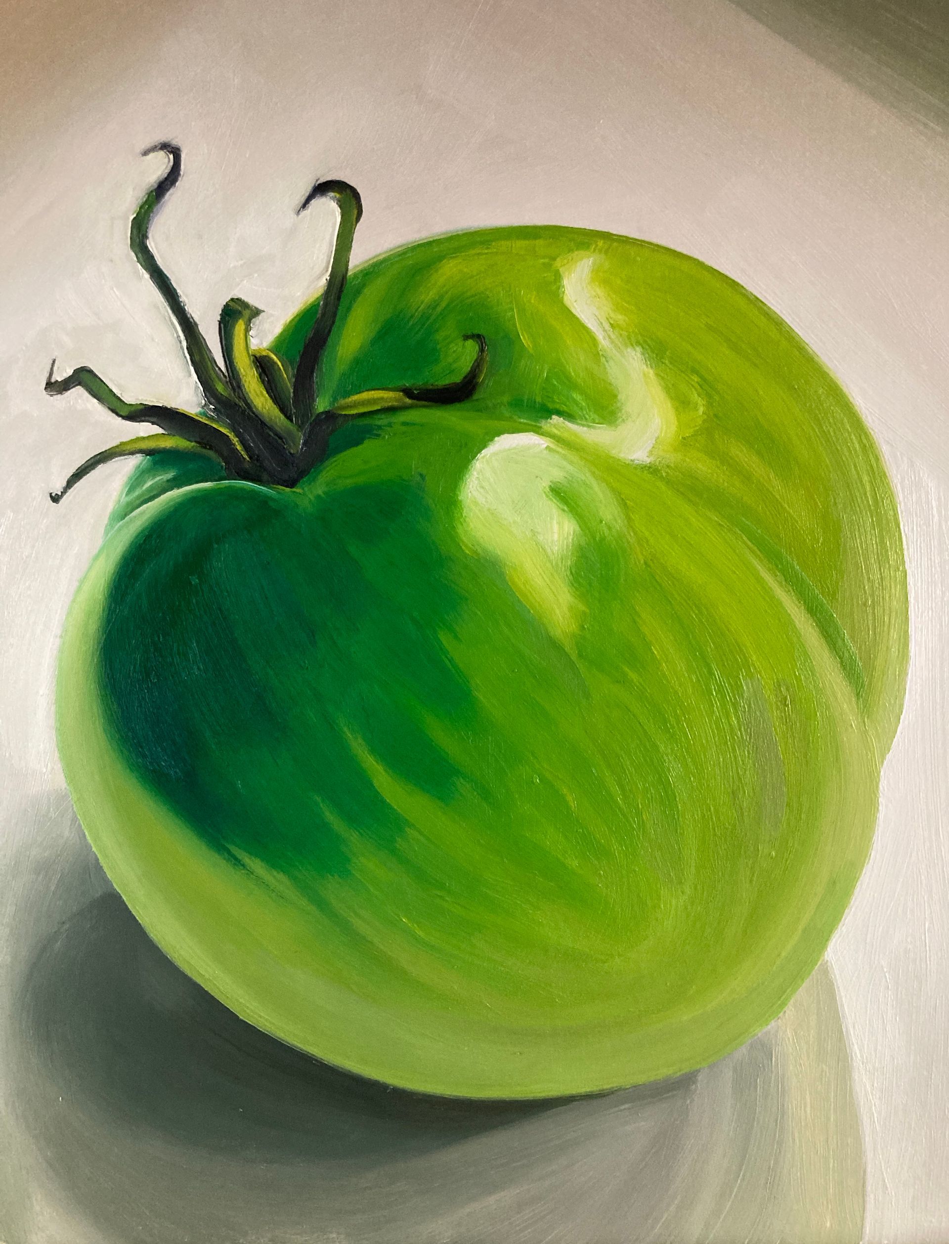 The paintings, in oils, are on the shiny side of hardboard which allows the texture of the paint and brush strokes to show.